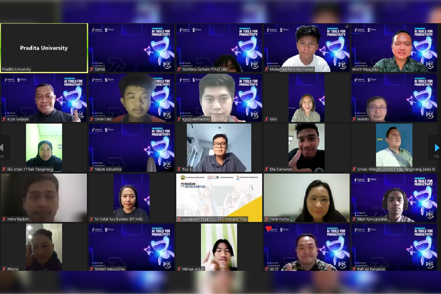 Dalam era yang semakin dipenuhi dengan inovasi teknologi, keberadaan Artificial Intelligence (AI) semakin menjadi bagian penting dalam berbagai aspek kehidupan, termasuk dalam meningkatkan produktivitas. Berkaitan dengan fenomena tersebut, Master’s Degree Information Technology Pradita University melalui program Pradita Learning Circle (PLC) menyelenggarakan sebuah webinar bertajuk "AI Tools for Productivity". Acara ini diselenggarakan pada 20 Januari 2024 dan dihadiri oleh para mahasiswa, akademisi, dan praktisi yang tertarik dalam penerapan AI untuk meningkatkan produktivitas mereka.