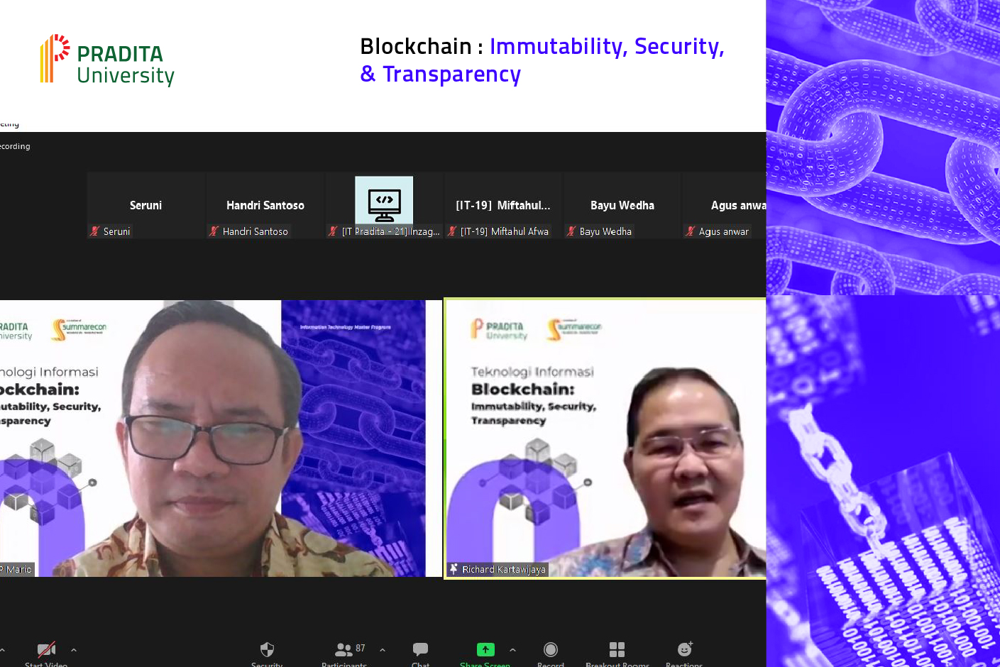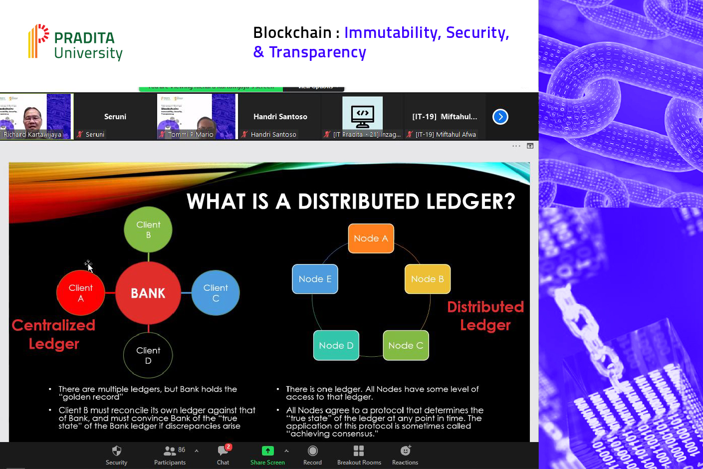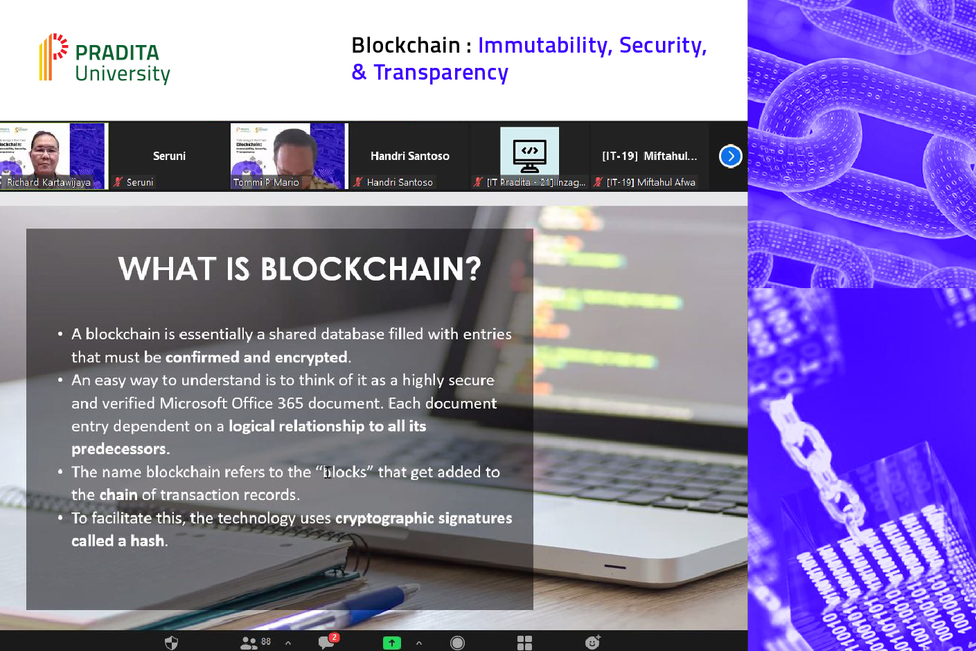 Jumat, 1 April 2022 lalu program studi Information Technology dan Master Program Pradita University mengadakan kuliah umum dengan tema ‘Blockchain: immutability, Security, Transparency’. Acara ini dihadiri oleh Bapak Richard Kartawijaya, former first CEO of Microsoft Indonesia dan CEO Linkdataku Solusi Indonesia sebagai pembicara, dan Dr. Eng Handri Santoso, S.Si., M.Eng, kepala program studi information technology dan program master Pradita University, sebagai moderator.